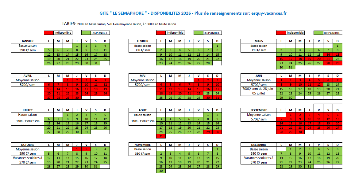 Les tarifs sont indiqués par semaine de location et varient en fonction de la saison. Les prix indiqués comprennent la location du gîte, mais ne comprend pas les charges (eau, électricité).